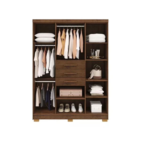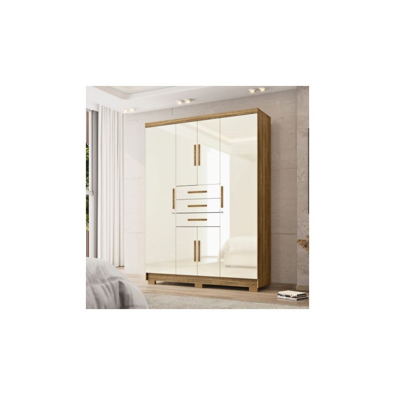 Este armario ofrece una solución perfecta para el almacenamiento en el hogar. Con puertas amplias y cajones centrales, proporciona espacio para ropa, accesorios y más, manteniendo todo en orden y a la vista. Su acabado cálido en madera lo convierte en un complemento ideal para cualquier dormitorio, añadiendo un toque de calidez y elegancia al ambiente.